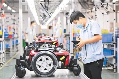 近來,江西省豐城市外貿(mào)企業(yè)通過與電商平臺(tái)合作、云推介等方式促進(jìn)企業(yè)穩(wěn)產(chǎn)增效。圖為豐城市捷和電機(jī)(江西)有限公司員工在生產(chǎn)線上組裝電動(dòng)輪椅車,準(zhǔn)備出口至歐洲、中東、非洲等地市場(chǎng)。周 亮攝(人民視覺)