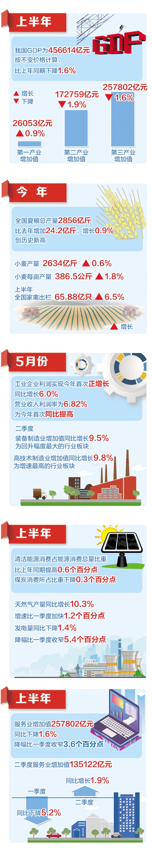 上半年,我國GDP為456614億元,按不變價(jià)格計(jì)算,比上年同期下降1.6%。其中,第一產(chǎn)業(yè)增加值26053億元,增長0.9%;第二產(chǎn)業(yè)增加值172759億元,下降1.9%;第三產(chǎn)業(yè)增加值257802億元,下降1.6%。