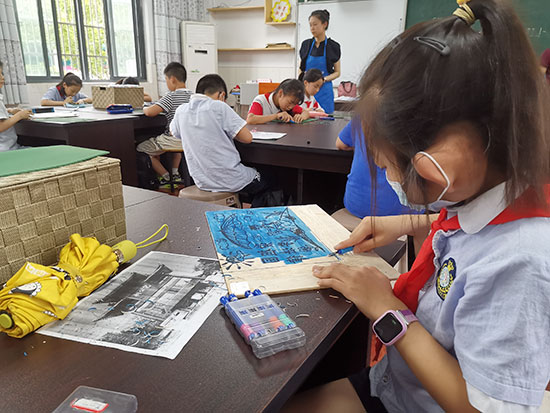 在該校,版畫社團就將美育與勞動教育進行了融合。美術老師王帆介紹,版畫的創(chuàng)作需經過起稿、印板、刻制、拓印等多個步驟,整個創(chuàng)作過程可以鍛煉學生的細心、耐心和邏輯思維。