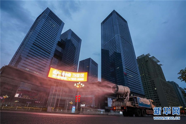 7月20日,烏魯木齊市天山區(qū)城管局清運隊的工作車輛在市區(qū)光明路進行消殺作業(yè)。 新華社記者 趙戈 攝