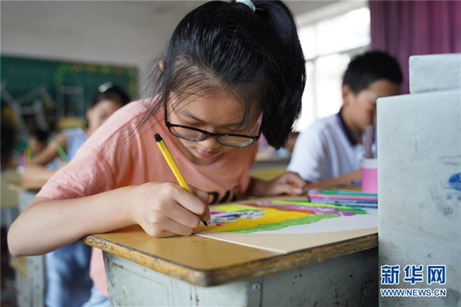 7月23日,在廬山市蛟塘鎮(zhèn)中心小學(xué)安置點(diǎn),小朋友在美術(shù)課上繪畫(huà)。新華社記者 張浩波 攝