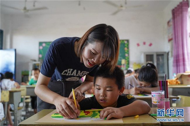 7月23日,在廬山市蛟塘鎮(zhèn)中心小學(xué)安置點(diǎn),一名老師在指導(dǎo)孩子繪畫(huà)。新華社記者 張浩波 攝