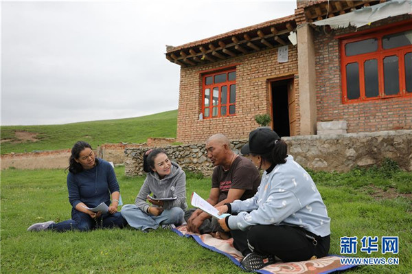 7月23日,在甘肅省甘南藏族自治州夏河縣??奇?zhèn)崗岔村,卓瑪吉(左二)和駐村幫扶工作隊(duì)隊(duì)員一起入戶(hù)了解村民巴桑一家的生產(chǎn)生活情況。崗岔村是甘肅省甘南藏族自治州夏河縣??奇?zhèn)的一個(gè)牧業(yè)村,平均海拔3000米以上。2018年,在夏河縣文明辦工作的卓瑪吉開(kāi)始擔(dān)任駐村幫扶工作隊(duì)隊(duì)長(zhǎng),每年都有200多天待在草原上。兩年來(lái),卓瑪吉帶領(lǐng)大家開(kāi)辦扶貧車(chē)間,發(fā)展特色產(chǎn)業(yè),聯(lián)系勞務(wù)輸出。為了讓村民更全面地了解精準(zhǔn)扶貧政策,卓瑪吉登門(mén)宣講政策。為了提高村容村貌,卓瑪吉發(fā)動(dòng)大家開(kāi)展廁所革命和庭院環(huán)境評(píng)比,積極響應(yīng)甘南藏族自治州“全域無(wú)垃圾”創(chuàng)建行動(dòng)。她還從縣城請(qǐng)來(lái)醫(yī)生,為村民舉辦健康講座,在全村婦女中開(kāi)展“兩癌篩查”。如今,崗岔村變成了干凈、整齊、富裕、美麗的生態(tài)文明村,提前實(shí)現(xiàn)了整村脫貧。談起心愿,卓瑪吉說(shuō):“要讓草原和草原上的人都變得更美。”新華社發(fā)(杜哲宇攝)