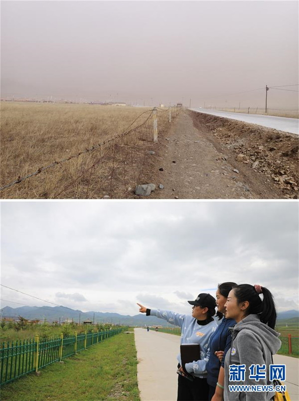 拼版照片:上圖為崗岔村村道綠化改造前的面貌(資料照片)。下圖為7月23日,卓瑪吉(右一)和駐村幫扶工作隊(duì)隊(duì)員站在綠化改造后的崗岔村村道上,謀劃下一步的工作。新華社發(fā)(杜哲宇攝)崗岔村是甘肅省甘南藏族自治州夏河縣??奇?zhèn)的一個(gè)牧業(yè)村,平均海拔3000米以上。2018年,在夏河縣文明辦工作的卓瑪吉開(kāi)始擔(dān)任駐村幫扶工作隊(duì)隊(duì)長(zhǎng),每年都有200多天待在草原上。兩年來(lái),卓瑪吉帶領(lǐng)大家開(kāi)辦扶貧車(chē)間,發(fā)展特色產(chǎn)業(yè),聯(lián)系勞務(wù)輸出。為了讓村民更全面地了解精準(zhǔn)扶貧政策,卓瑪吉登門(mén)宣講政策。為了提高村容村貌,卓瑪吉發(fā)動(dòng)大家開(kāi)展廁所革命和庭院環(huán)境評(píng)比,積極響應(yīng)甘南藏族自治州“全域無(wú)垃圾”創(chuàng)建行動(dòng)。她還從縣城請(qǐng)來(lái)醫(yī)生,為村民舉辦健康講座,在全村婦女中開(kāi)展“兩癌篩查”。如今,崗岔村變成了干凈、整齊、富裕、美麗的生態(tài)文明村,提前實(shí)現(xiàn)了整村脫貧。談起心愿,卓瑪吉說(shuō):“要讓草原和草原上的人都變得更美。”新華社發(fā)