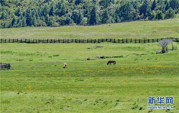 魯朗旅游小鎮(zhèn)的牧場(chǎng)(7月26日攝)。新華社記者張汝鋒攝