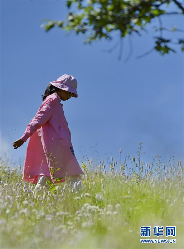一名游客在魯朗旅游小鎮(zhèn)的高山牧場(chǎng)游玩(7月26日攝)。新華社記者張汝鋒攝