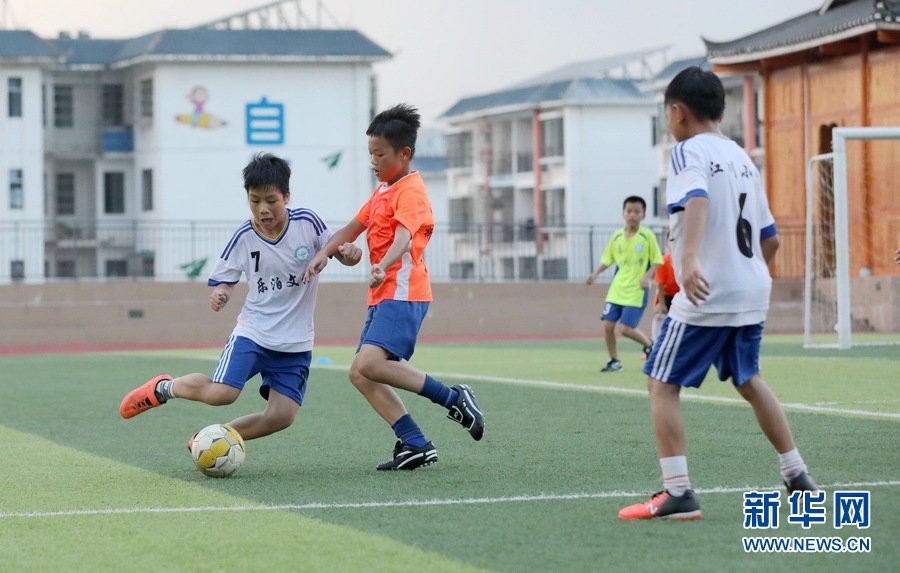 學(xué)生們?cè)谌弊遄灾慰h古宜鎮(zhèn)江川小學(xué)訓(xùn)練足球。