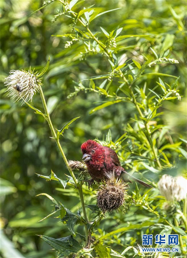 8月23日在金佛山自然保護(hù)區(qū)拍攝的酒紅朱雀。 每年7月至9月,活躍于重慶市南川區(qū)金佛山上的酒紅朱雀是當(dāng)?shù)匾坏懒聋惖娘L(fēng)景。 新華社發(fā)(瞿明斌 攝)