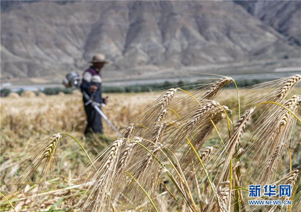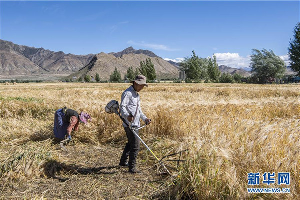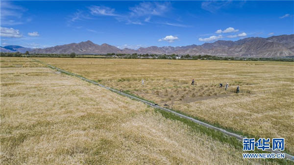 8月29日,農民在日喀則市江孜縣的青稞田里忙收割。日喀則是西藏重要的商品糧基地,被譽為“西藏糧倉”。當前正值青稞收獲季節(jié),當?shù)剞r民抓緊收割,農田里一片繁忙景象。新華社記者孫非攝