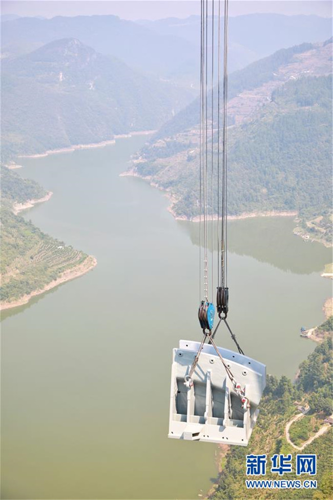 9月1日,工作人員在對(duì)主索鞍進(jìn)行吊裝。新華社記者劉續(xù)攝
