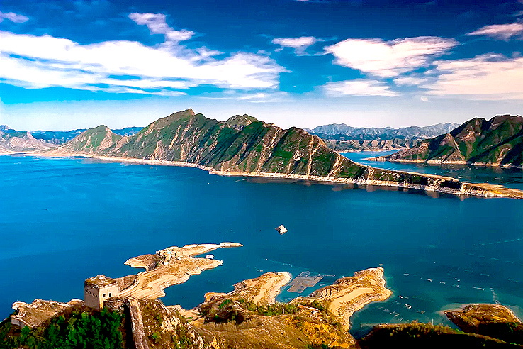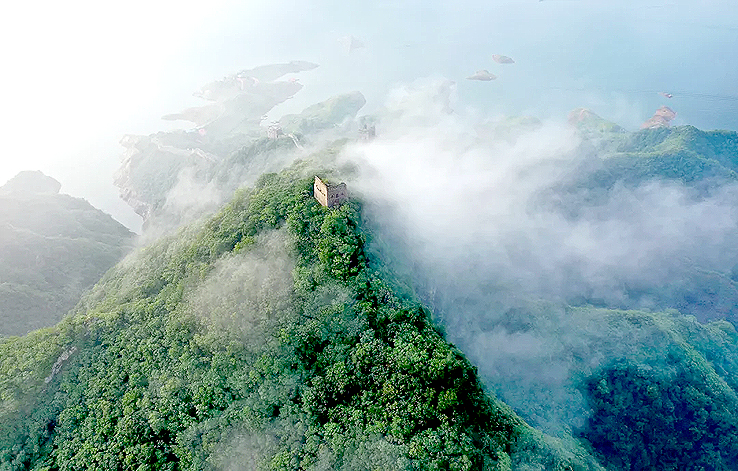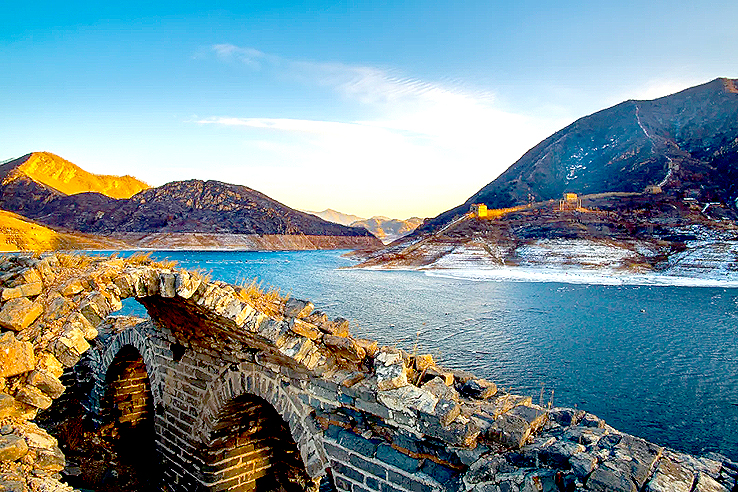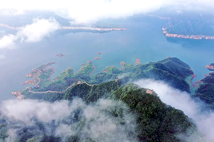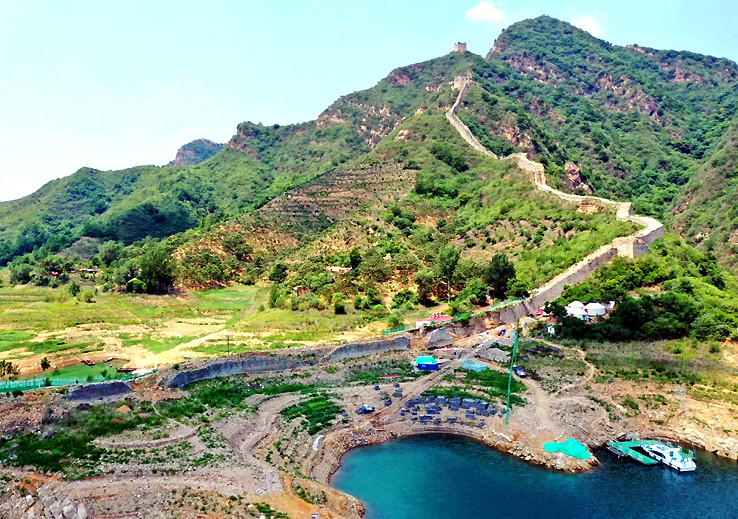 從空中俯瞰,長(zhǎng)城順著逶迤的燕山山脈一直伸向水岸邊,猶如巨龍一頭扎進(jìn)水里。一座水庫(kù)的出現(xiàn),不經(jīng)意間營(yíng)造了絕美的“長(zhǎng)城水鄉(xiāng)”。