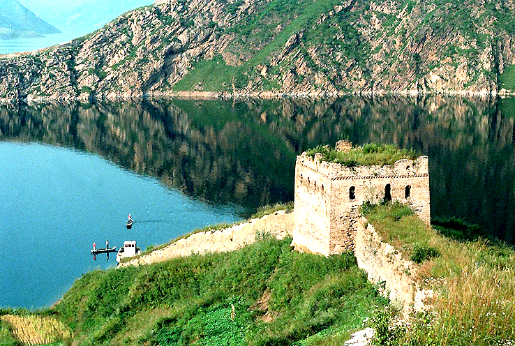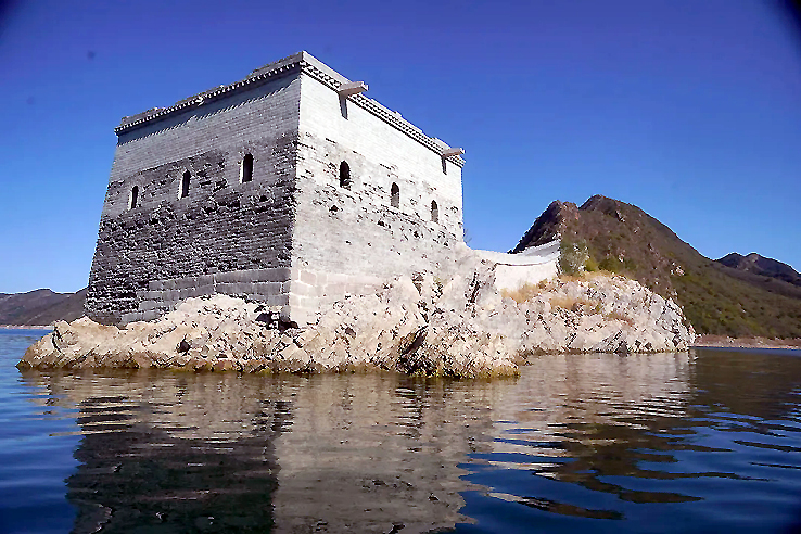 潘家口水庫(kù)“水下長(zhǎng)城”,一船只從城墻邊駛過(guò)(攝于2012年)。新華社發(fā)(朱建軍 攝)