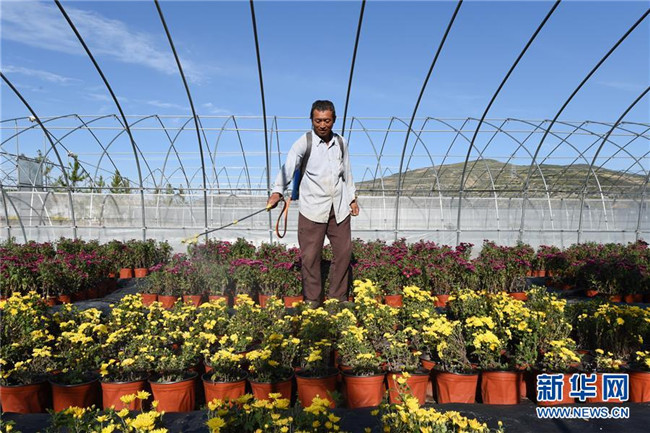 在定西市安定區(qū)魯家溝鎮(zhèn)將臺(tái)村,陳瑞福在花卉育苗基地里忙碌(9月2日攝)。 新華社記者 范培珅 攝