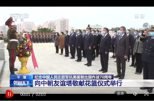 當(dāng)?shù)貢r間21日,以中共中央總書記、國家主席、中央軍委主席習(xí)近平名義向朝鮮平壤中朝友誼塔、檜倉中國人民志愿軍烈士陵園敬獻(xiàn)花籃儀式在朝鮮舉行。中國駐朝鮮大使率全體館員及其他在朝中方人員代表出席。