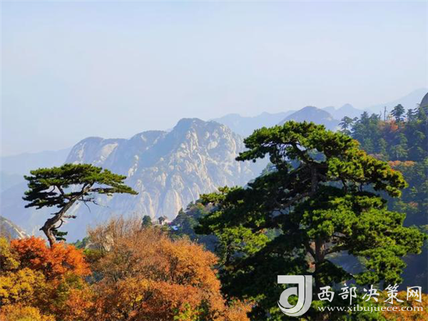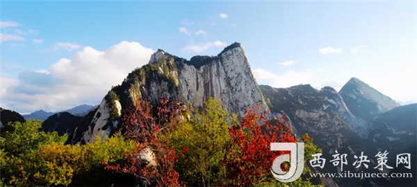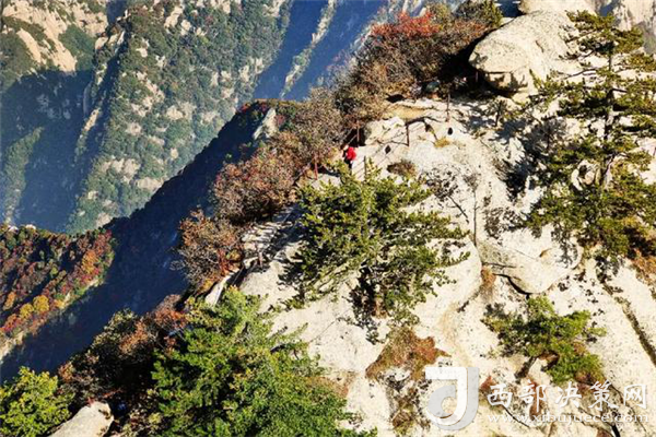 秋天的華山很是動(dòng)人。天高云淡,漫山紅葉分外妖嬈,彩林賞心悅目,一步一景,滿目所見皆是驚喜。若是乘索道而上,層林金黃與郁郁蔥蔥的華山松、灰白的花崗巖山體相互迎映襯,形成了秋天多彩的西岳風(fēng)光。