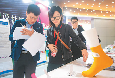 日前,中國設(shè)計紅星獎(諸暨)產(chǎn)品設(shè)計大賽在浙江省諸暨市開啟現(xiàn)場實物評審。為推動襪業(yè)“設(shè)計+科技”的創(chuàng)新,今年的主題聚焦襪業(yè),共有387件擁有外觀設(shè)計專利的作品入圍實物終評。江 漢攝(新華社發(fā))