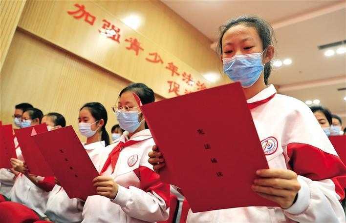 11月30日,陜西省2020年“憲法宣傳周”啟動儀式在西安舉行。全省13個(gè)市(區(qū))107個(gè)縣(區(qū))統(tǒng)一啟動實(shí)施。這是西安高新區(qū)第五小學(xué)探花嶺校區(qū)學(xué)生正在誦讀憲法。 記者 安濤 攝