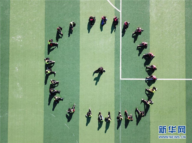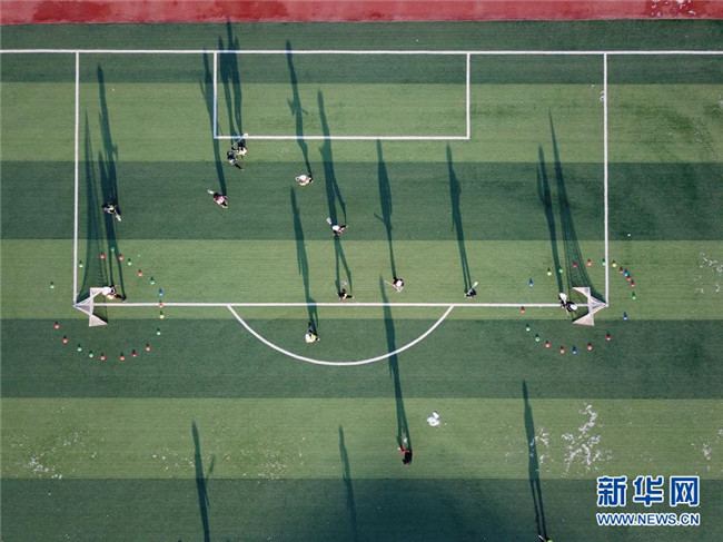 12月1日,在灤平縣第五小學,棍網(wǎng)球隊員在進行訓練(無人機照片)。新華社發(fā)(王立群 攝)