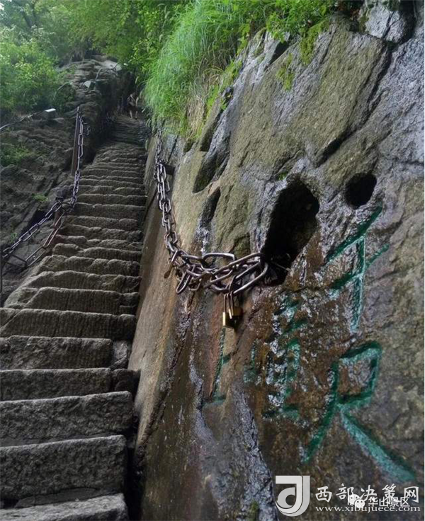 華山的登山之路蜿蜒曲折,到處都是懸崖絕壁。智取華山路開辟之前,華山只有一條十分陡峭的道路可以通到山上,人們常用“自古華山一條道”的說法來形容它的險(xiǎn)要。