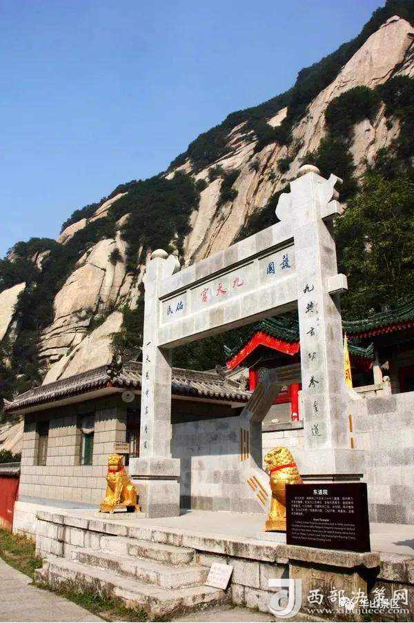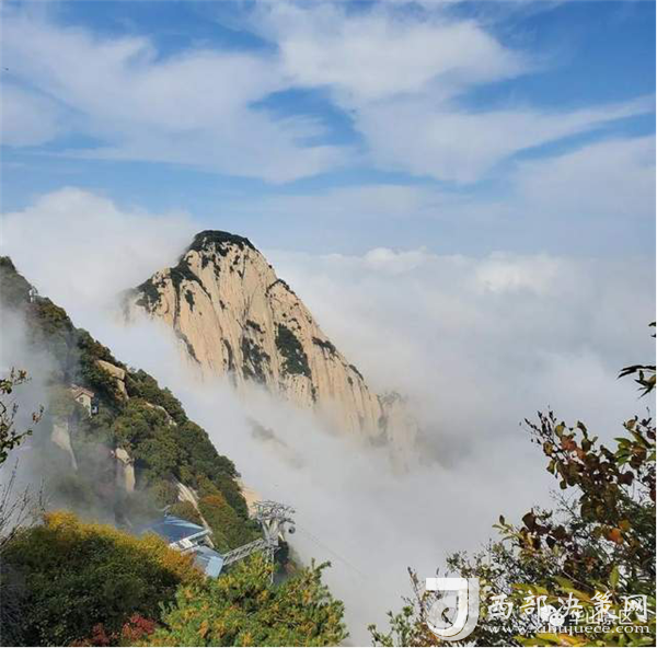 整個(gè)西峰為一塊渾然天成的巨石,北面臨空,懸崖絕壁如刀削鋸截,東西兩側(cè)狀如蓮花,因此也稱“蓮花峰”,這里更是“劈山救母”、“寶蓮燈”等傳說故事的發(fā)生地。