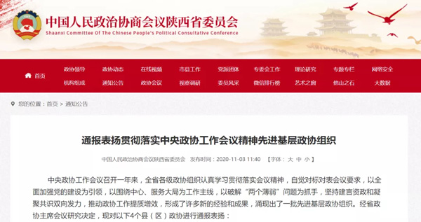 中央政協(xié)工作會議召開一年多來,陜西全省各級政協(xié)組織認(rèn)真貫徹落實(shí)會議精神,堅(jiān)持建言資政和凝聚共識雙向發(fā)力,推動(dòng)政協(xié)工作提質(zhì)增效,形成了許多新的經(jīng)驗(yàn)和成果,涌現(xiàn)出了一批先進(jìn)基層政協(xié)組織。2020年11月2日,省政協(xié)十二屆四十七次主席會議決定通報(bào)表揚(yáng)貫徹落實(shí)中央政協(xié)工作會議精神先進(jìn)基層政協(xié)組織,金臺區(qū)政協(xié)、富平縣政協(xié)、富縣政協(xié)和柞水縣政協(xié)4家縣(區(qū))政協(xié)組織榜上有名。
