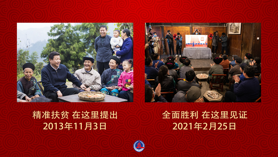 右圖:2021年2月25日上午,在湖南省湘西土家族苗族自治州花垣縣雙龍鎮(zhèn)十八洞村,當(dāng)?shù)馗刹?、群眾在一戶村民家收看全?guó)脫貧攻堅(jiān)總結(jié)表彰大會(huì)直播,聆聽(tīng)習(xí)近平總書記宣布脫貧攻堅(jiān)勝利的喜訊。電視畫面中十八洞村黨支部書記、村委會(huì)主任施金通代表十八洞村領(lǐng)取“全國(guó)脫貧攻堅(jiān)楷模”榮譽(yù)稱號(hào)(新華社記者 陳思汗 攝)。