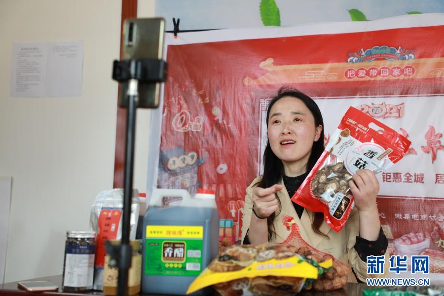2月23日,在位于甘肅隴南市徽縣的店鋪中,全國(guó)人大代表梁倩娟在網(wǎng)上直播銷售當(dāng)?shù)剞r(nóng)特產(chǎn)品?!⌒氯A社記者 張智敏 攝