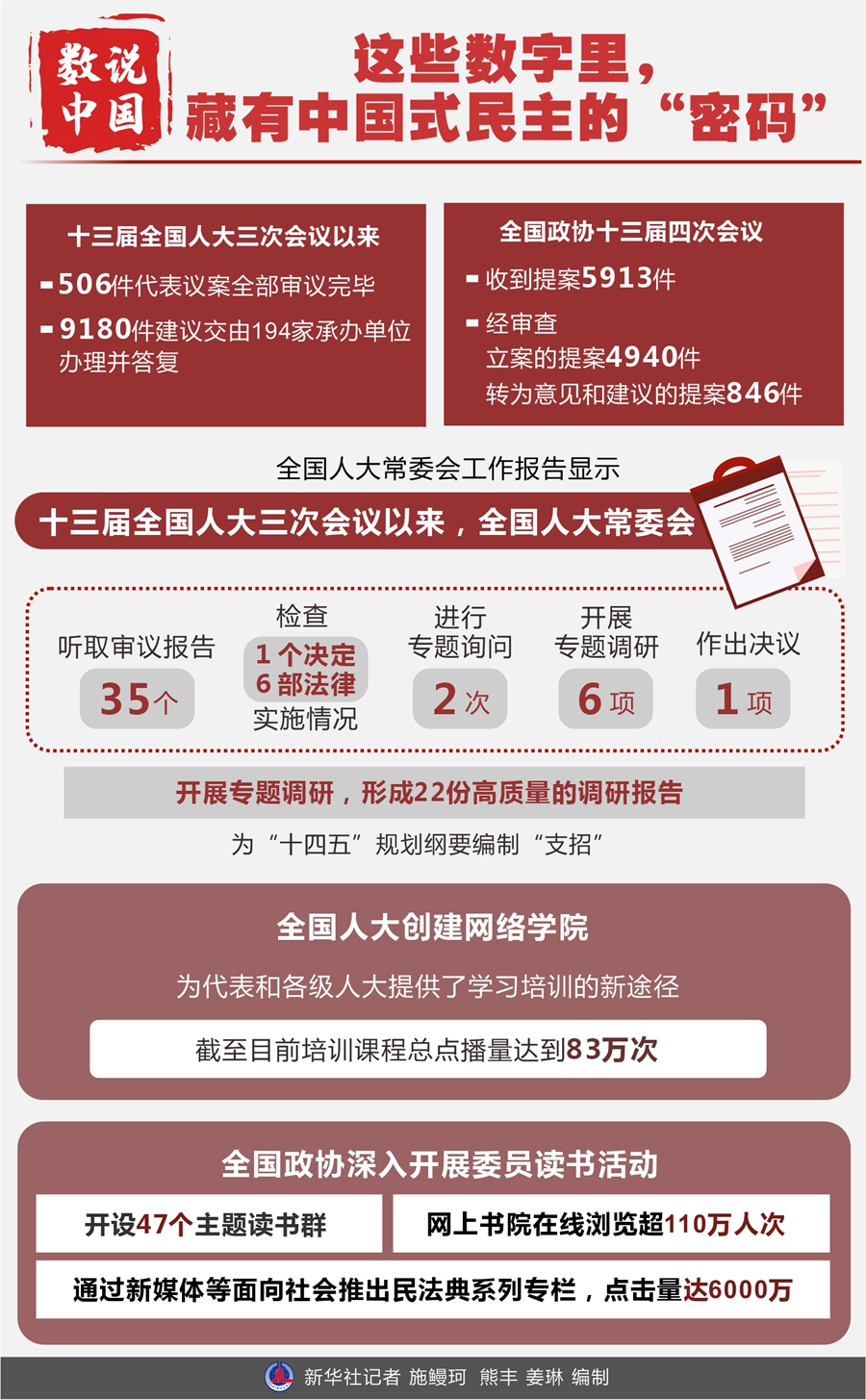 數(shù)字,蘊(yùn)藏中國式民主的“密碼”。透過全國人大常委會工作報(bào)告、全國政協(xié)常委會工作報(bào)告和提案工作情況報(bào)告,讓我們從幾組關(guān)鍵數(shù)據(jù)進(jìn)行“解碼”。