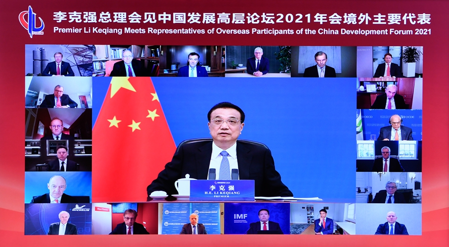 國(guó)務(wù)院總理李克強(qiáng)3月22日晚在人民大會(huì)堂以視頻方式會(huì)見出席中國(guó)發(fā)展高層論壇2021年年會(huì)的境外代表。來自世界五百?gòu)?qiáng)企業(yè)的負(fù)責(zé)人、國(guó)際知名學(xué)術(shù)研究機(jī)構(gòu)的專家學(xué)者和主要國(guó)際組織代表等參加。