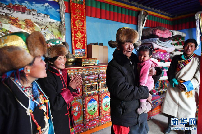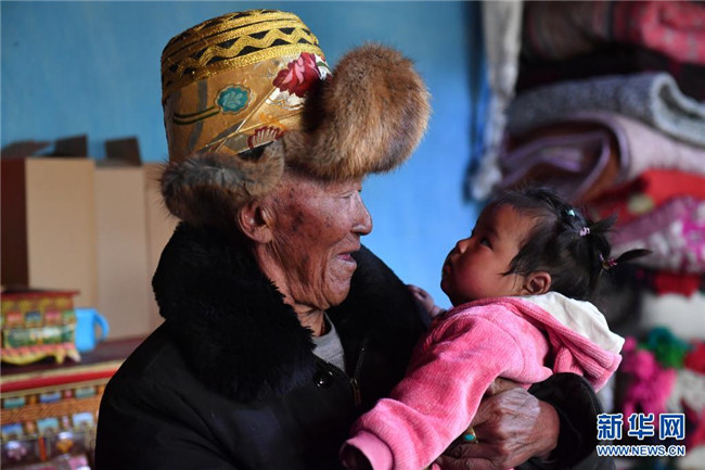 巴桑和九個(gè)月大的重外孫女白瑪色珍在一起(3月21日攝)。新華社記者 孫瑞博 攝