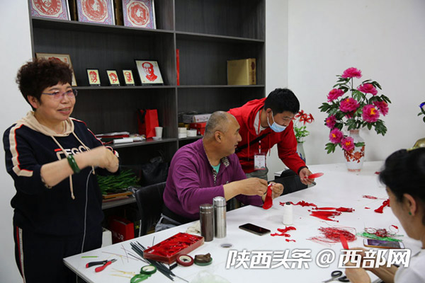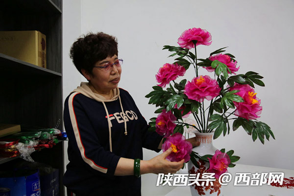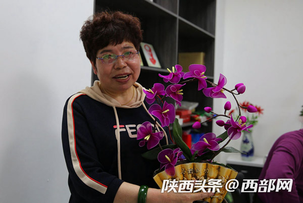 延安市寶塔區(qū)電商直播融合孵化服務(wù)中心,60歲的退休大媽董智玲在教大家做絲網(wǎng)花,她們做著山丹丹花,唱著《山丹丹花開紅艷艷》,到這里來學(xué)手工花的制作成了一件快樂的事。