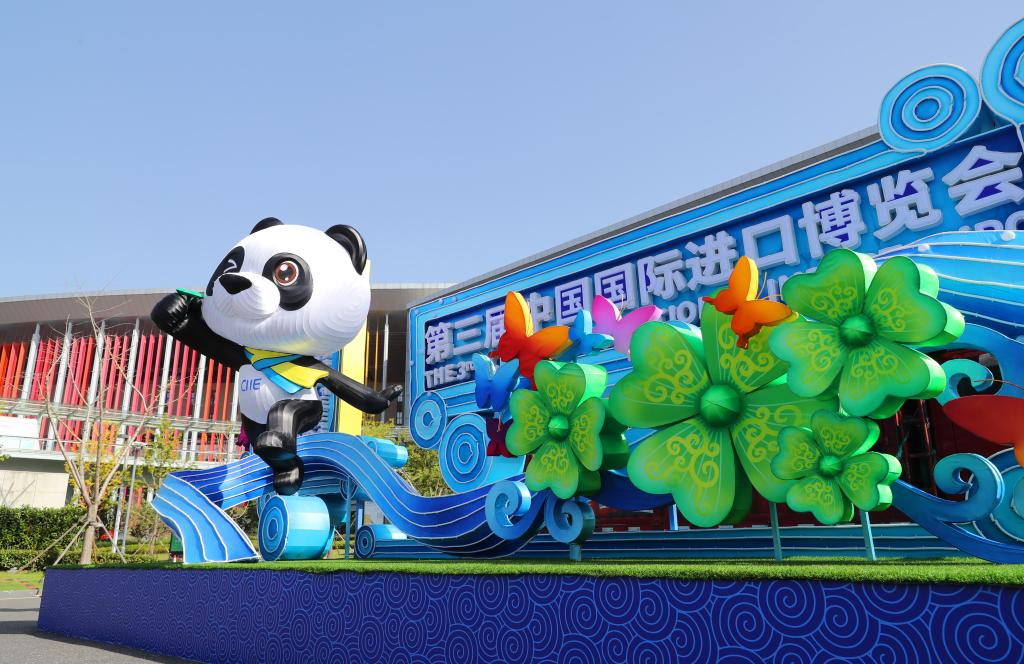 國家會展中心(上海)西入口處擺放的熊貓“進(jìn)寶”主題進(jìn)博會裝飾(2020年10月23日攝)。新華社記者 方喆 攝