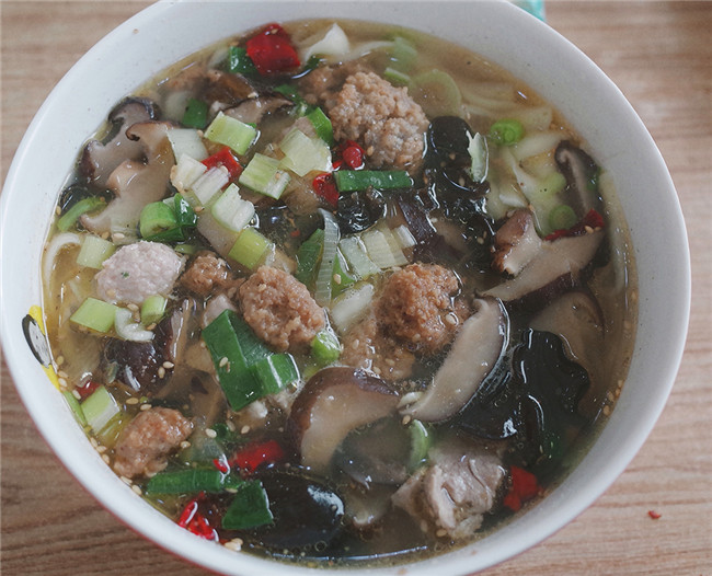 一碗18元的香菇面,里頭有香菇、蝦米、木耳、里脊肉片、汆肉丸子和油炸丸子等原料,再撒上蔥蒜和辣椒,香氣四溢。“以前還要放排骨和酥肉呢。”香菇面店的老板李瑞強說,父親1988年開始賣香菇面,父親去世后,他在鎮(zhèn)上開了店,希望能將這份味道長長久久傳承下去。
