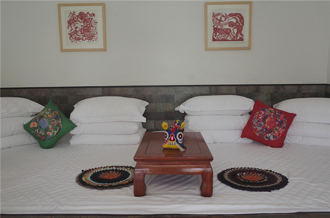 “大到喝茶的桌椅,小到墻上的剪紙,都是找專門手藝人做的。”小雅指著“炕”上的花坐墊說,這也是拿小孩不穿的布帛縫起來的,展現(xiàn)陜北特色的“百家衣”風格。陜北炕比較冰冷,她們就用木頭把炕包起來,再鋪上軟墊。
