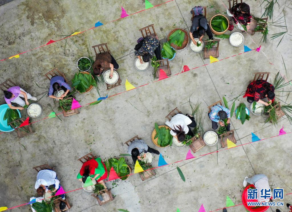 6月2日,貴州省銅仁市玉屏侗族自治縣亞魚鄉(xiāng)郭家灣村村民參加包粽子比賽。新華社發(fā)(胡攀學(xué)攝)
