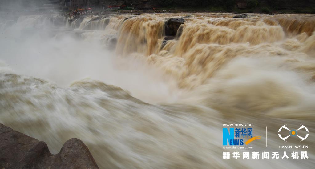 近日,受上游局部地區(qū)強(qiáng)降雨影響,黃河壺口瀑布出現(xiàn)“西邊濁流翻滾,東邊白浪滔滔”的奇特景觀。新華網(wǎng)發(fā)(呂桂明 攝)