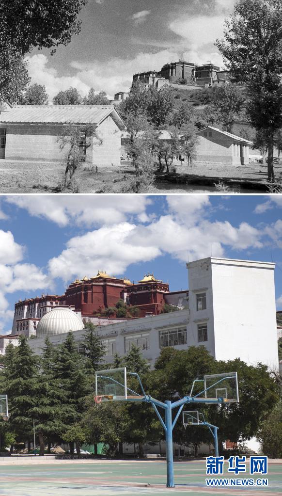 拼版照片:上圖是20世紀(jì)50年代拍攝的西藏第一所現(xiàn)代正規(guī)初級(jí)中學(xué)——拉薩中學(xué)一角(新華社記者景家棟攝);下圖是2021年8月9日拍攝的拉薩中學(xué)一角(新華社記者孫瑞博攝)。新華社發(fā)