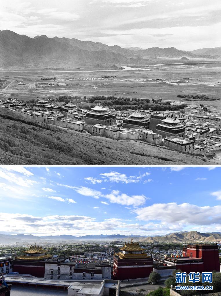 拼版照片:上圖是20世紀(jì)50年代拍攝的拉薩市景象(新華社發(fā) 藍(lán)志貴攝);下圖是2021年8月13日拍攝的拉薩市新貌(接片,新華社記者孫瑞博攝)。新華社發(fā)