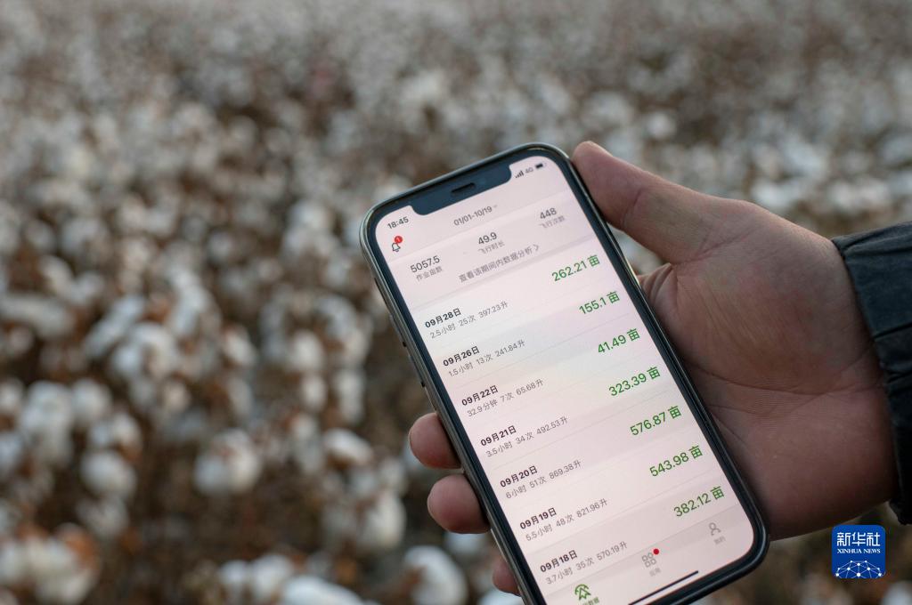 秋收時(shí)節(jié),陸德文展示自己使用無(wú)人機(jī)為自家和其他農(nóng)戶棉田打落葉劑的飛行數(shù)據(jù)(10月19日攝)。在親身感受過(guò)無(wú)人機(jī)飛防作業(yè)的便捷后,老陸家在今年8月買了一臺(tái)。新華社記者 胡虎虎 攝