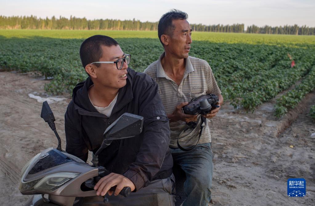 盛夏田間管理期間,陸高林的兒子陸德文(左)騎摩托車帶著農(nóng)業(yè)植保無(wú)人機(jī)操作手圍著棉地規(guī)劃飛防作業(yè)路線(7月15日攝)。新華社記者 胡虎虎 攝
