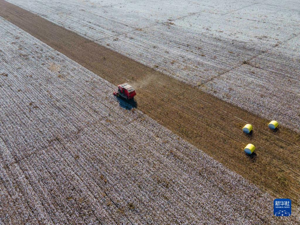 這是在新疆塔城地區(qū)沙灣市大泉鄉(xiāng)三道溝村拍攝的陸高林家的棉田(10月24日攝,無(wú)人機(jī)照片)。畫面左側(cè)為已采收的棉田,棉包擺放在地上,待價(jià)格合適時(shí),這些棉包將被運(yùn)往軋花廠售賣;右側(cè)為待采收的地塊。新華社記者 胡虎虎 攝
