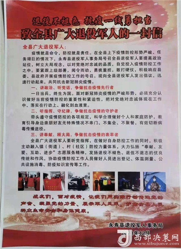 12月24日,永壽縣退役軍人事務(wù)局向全縣廣大退役軍人發(fā)出了《退役不褪色,抗疫一線勇?lián)?dāng)》的一封信,倡議一發(fā)出,志愿者們紛紛主動請纓,聯(lián)名遞交了疫情防控一線作戰(zhàn)的請戰(zhàn)書。連夜集結(jié),在永壽縣退役軍人事務(wù)局召開了“抗擊疫情沖鋒在前”退役軍人志愿者誓師動員大會,局主要負(fù)責(zé)同志向廣大退役軍人志愿者作了戰(zhàn)前動員,大家激情高漲,“必勝、必勝、必勝”的口號響徹整個大樓,用實際行動堅守在疫情防治的第一線。