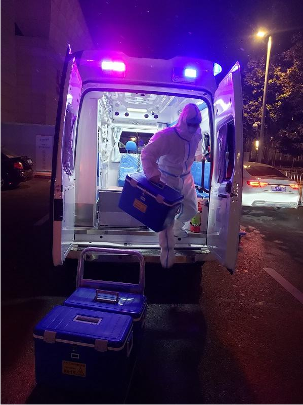 片刻休整后,劉鵬飛和隊(duì)員們又驅(qū)車投入轉(zhuǎn)運(yùn)核酸檢測樣本的任務(wù)……