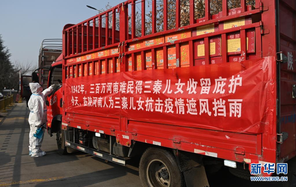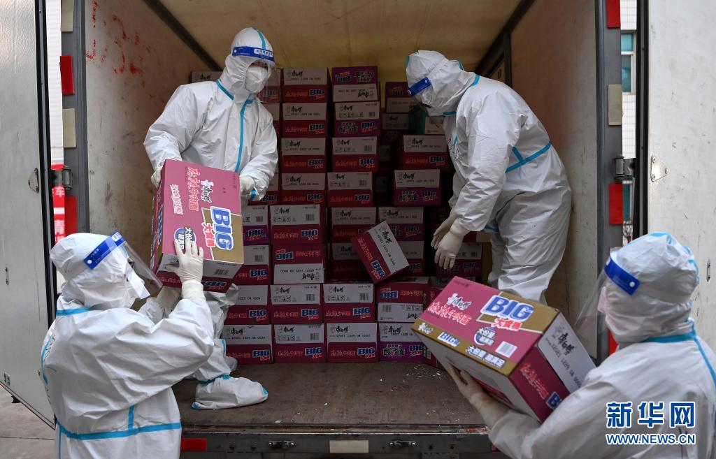 1月2日,西安醫(yī)學(xué)院的學(xué)生志愿者在搬運物資。當(dāng)日,陜西省農(nóng)副食品商會向西安醫(yī)學(xué)院捐贈價值40余萬元的愛心蔬菜、食品物資、生活物資。