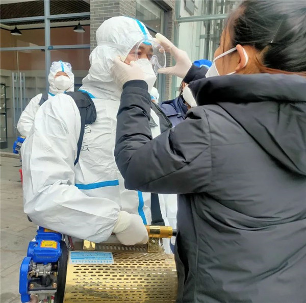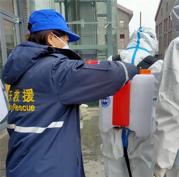 榆林藍(lán)天救援隊迅速穿戴好防護(hù)服準(zhǔn)備就緒,隊友們互相對照檢查防護(hù)服穿著是否規(guī)范、彌霧機佩戴是否安全、消殺區(qū)域的配合等事項。
