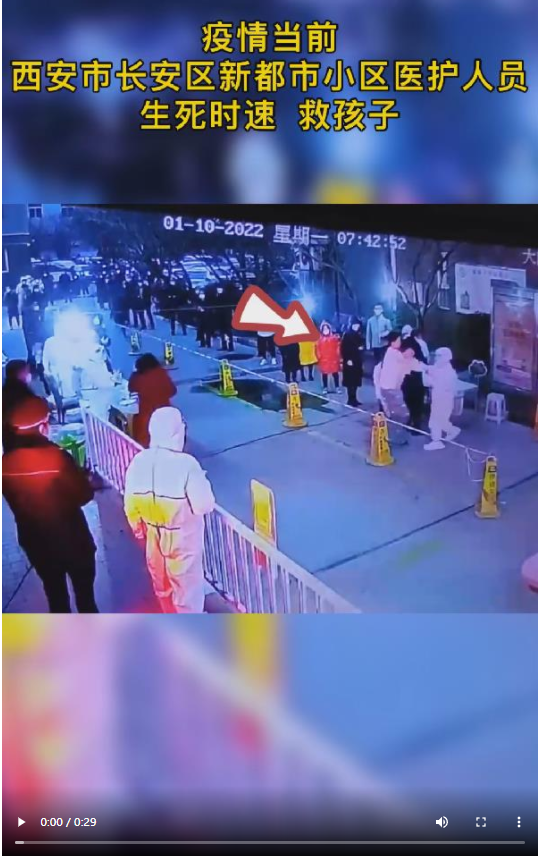 “救命!救我孩子??!”天蒙蒙亮,小區(qū)居民正有序等待做核檢。一名婦女抱著一個幼童大聲喊叫救命。