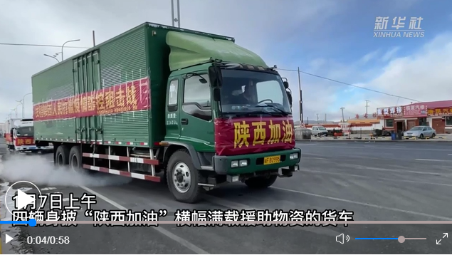 4輛披著“陜西加油”橫幅的貨車