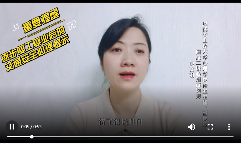 隨著西安復(fù)工復(fù)產(chǎn)的推進(jìn),“開(kāi)車(chē)出門(mén)”成了恢復(fù)常態(tài)化防控之后,很多市民面臨的第一件事。今天(1月15日),西安交警邀請(qǐng)?jiān)渚こ檀髮W(xué)心理學(xué)教研室主任、副教授,國(guó)家二級(jí)心理咨詢(xún)師倪文娟,提醒駕駛員在家中狹小的空間內(nèi)長(zhǎng)時(shí)間封閉后,如何保持安全出行心態(tài)。