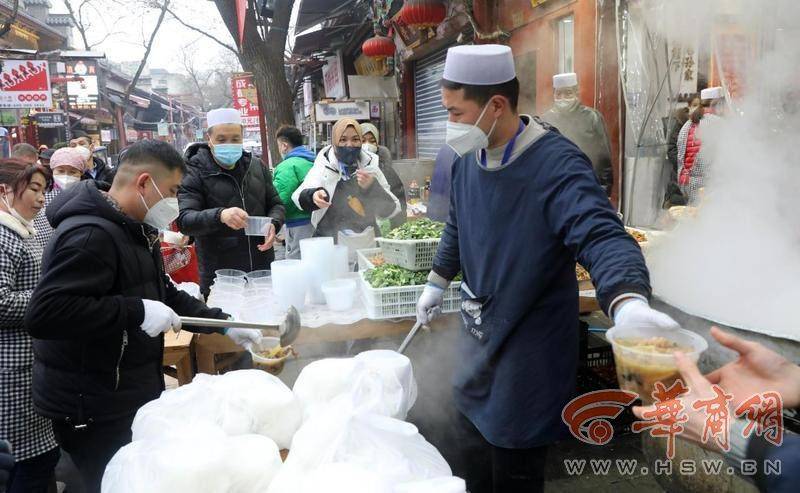 在回民街回坊老孫家泡饃店,服務(wù)員正在給周邊環(huán)衛(wèi)工免費(fèi)提供午飯。“自疫情嚴(yán)控以來(lái),我們每天為周邊參加一線(xiàn)防疫工作者近千份清真熟食,以感謝他們對(duì)西安市防疫做出的貢獻(xiàn)。”該店負(fù)責(zé)人說(shuō)。