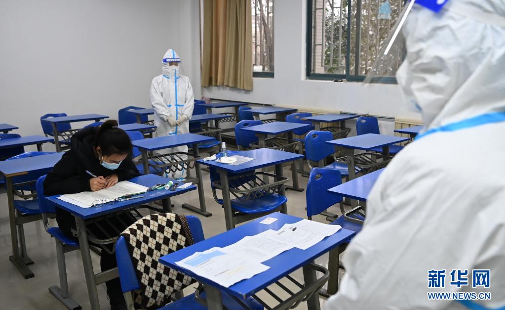 在2022年全國(guó)碩士研究生招生考試西安外國(guó)語大學(xué)考點(diǎn)隔離考區(qū),監(jiān)考人員在單人隔離考場(chǎng)監(jiān)考??荚囍?,監(jiān)考人員全程著防護(hù)服工作,學(xué)生午休時(shí)不出考區(qū),學(xué)校為每名考生提供免費(fèi)午餐。各方全力以赴為考生“保駕護(hù)航”,確保考試順利進(jìn)行。新華社記者 劉瀟 攝